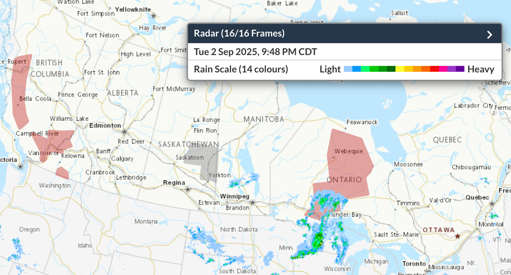 Good morning, with harvest underway the markets are moving. Good Luck this season — Bit of rain north of Winnipeg and area developing, rain expected throughout the week. A larger rain system moving east over the Thunder Bay area.